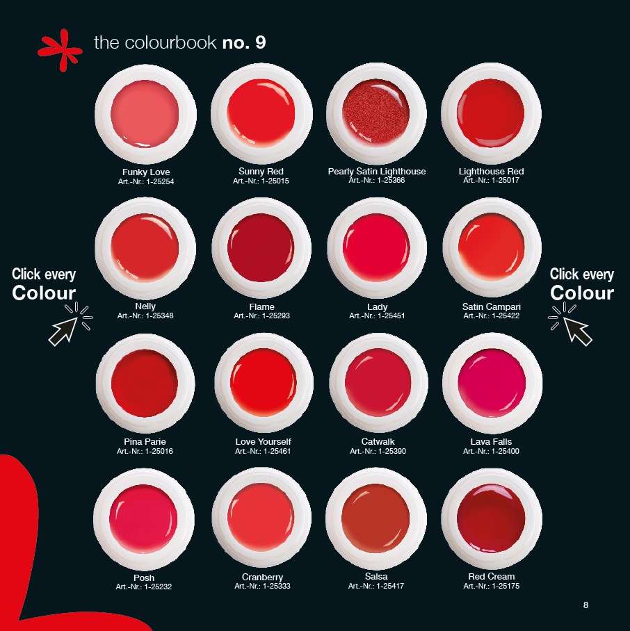 | Laden Sie sich unbedingt unser aktuelles Colourbook herunter und informieren sich ausführlich über unsere komplettte Farbgel-Kollektion. Viel Spaß beim Stöbern! | ![]() |